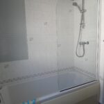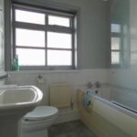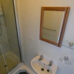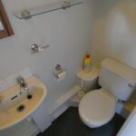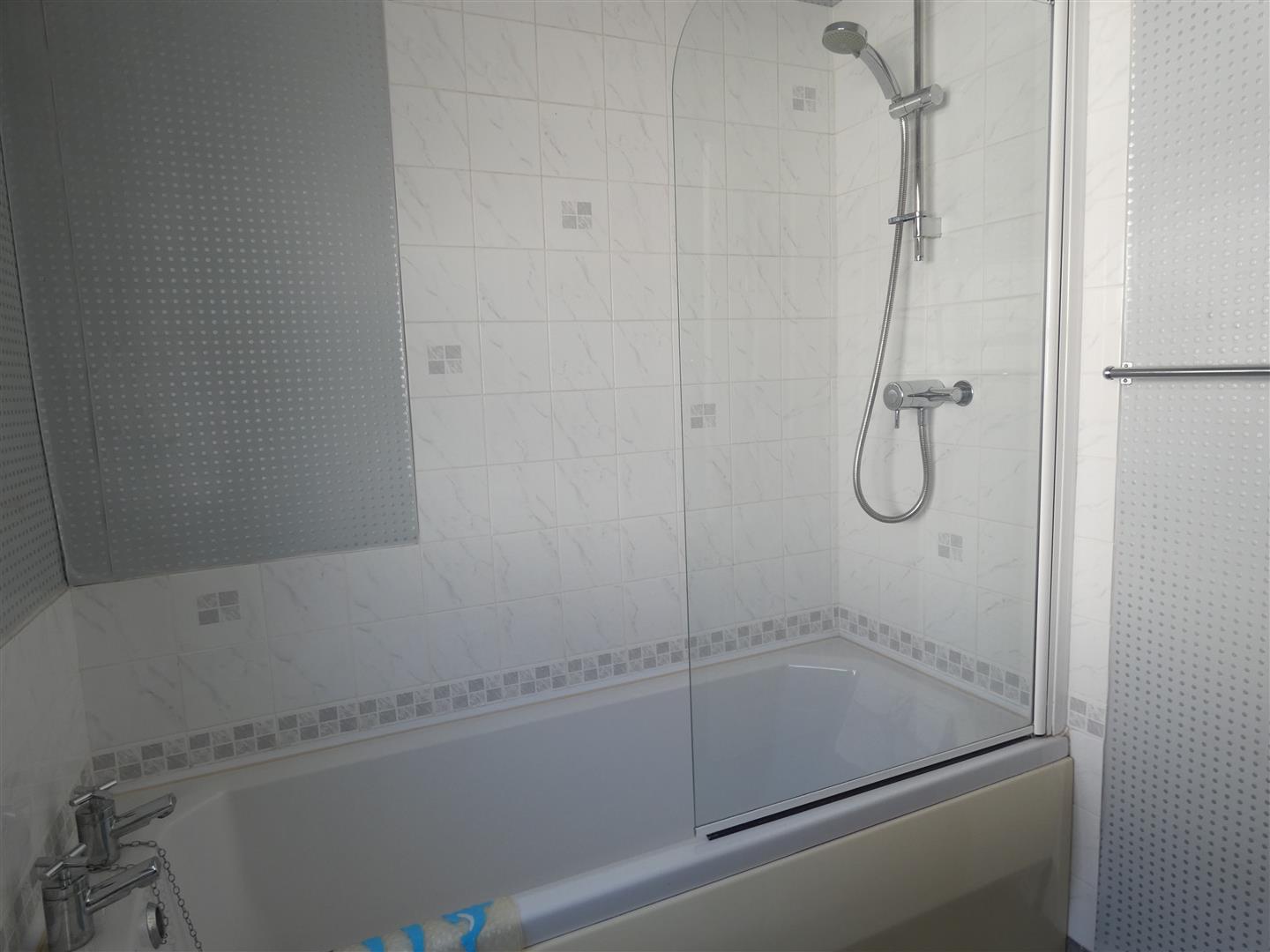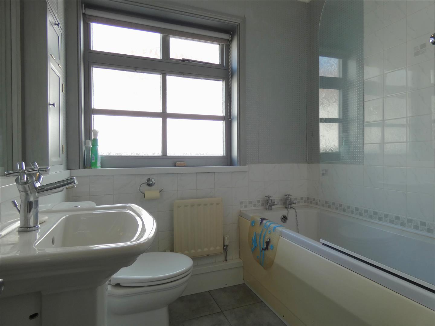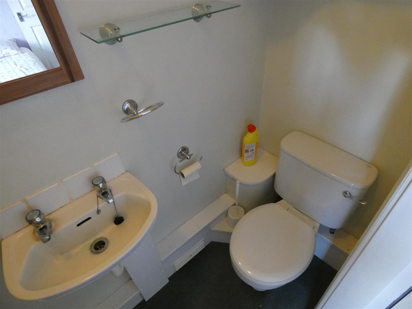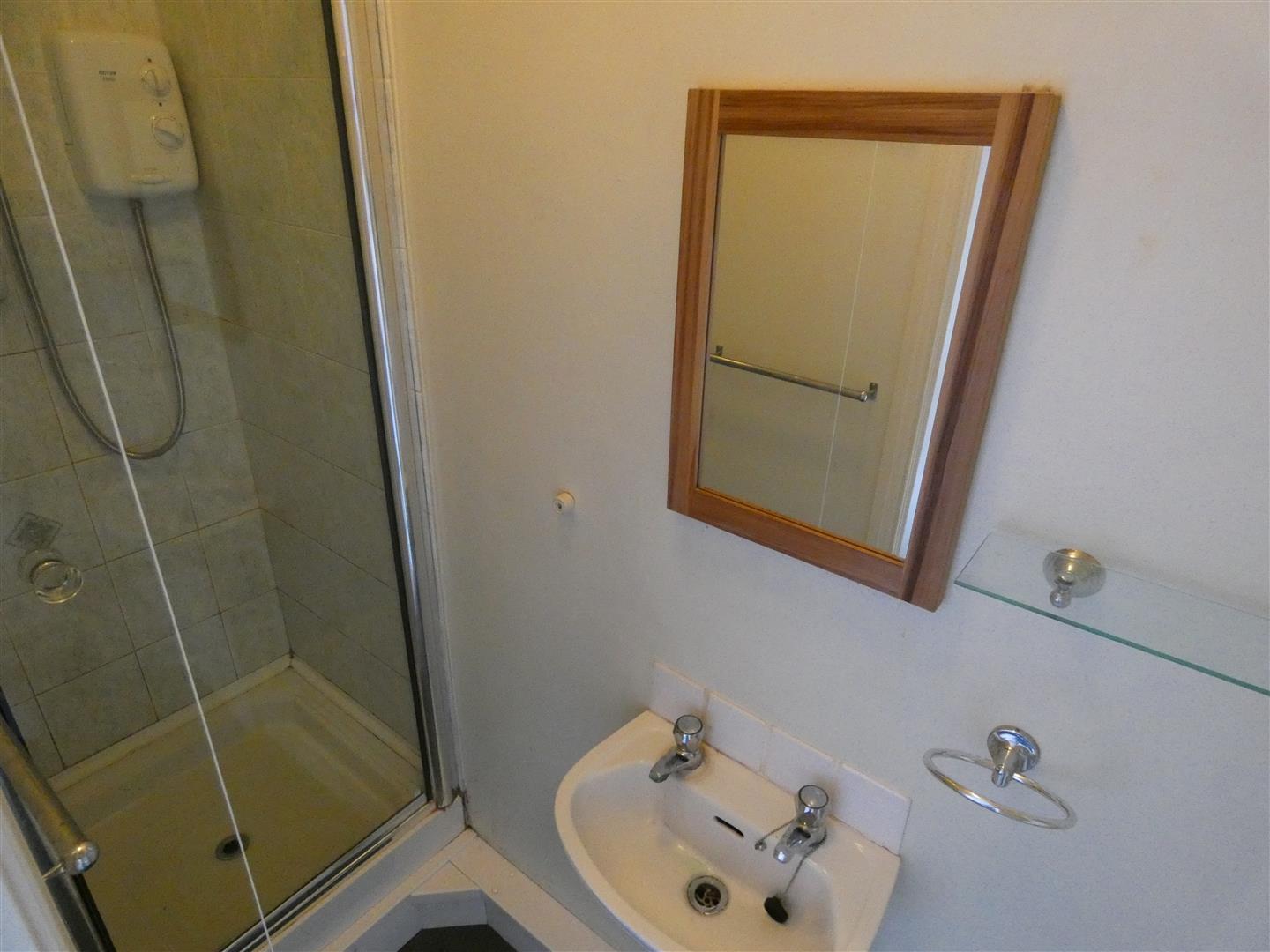 With tiled shower enclosure housing a Triton T80i electric shower & glass door, wall mounted wash hand basin with tiled splash, low flush Wc, extraction fan, coved and textured ceiling with light point, wall mounted electric heater.