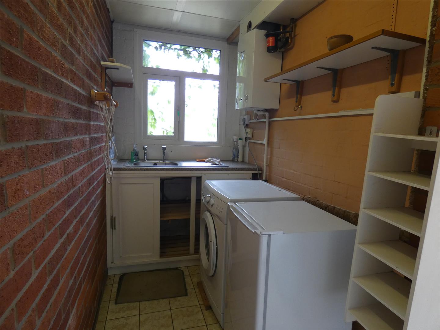 With uPVC window to the rear elevation, plumbing point for washing machine, single drainer sink with taps over, power points, wall mounted Worcester condensing boiler, Lifestyle central heating controller, shelving, strip light, ceramic tiled flooring, sliding door to Garage