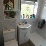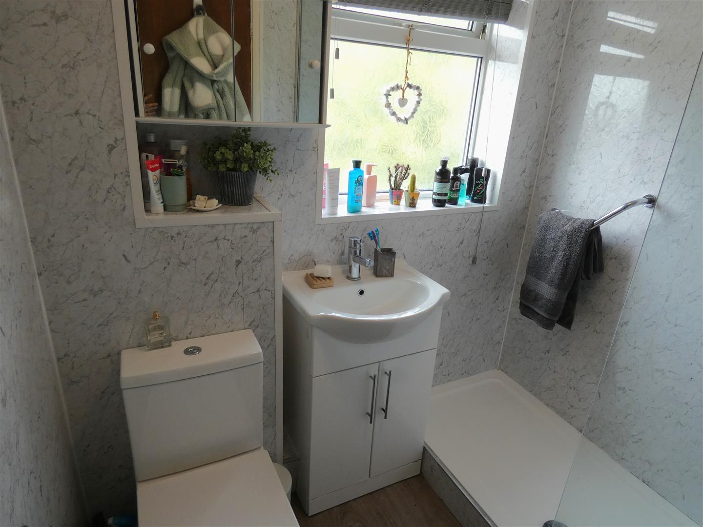 Fitted with a three piece white bathroom suite comprising of WC, vanity unit with wash hand basin, walk in double shower with mains dual headed shower. With uPVC opaque double glazed window to the rear, dome ceiling light, stainless steel heated towel rail and wet walling throughout.